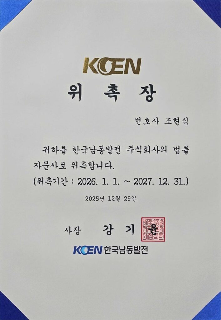 - 한국남동발전 주식회사 법률고문 위촉새해의 시작과 함께 해바람 법률사무소에 전해진 뜻깊은 소식을 공유하고자 합니다…. 자세히 보기: 한국남동발전 주식회사 법률고문 위촉