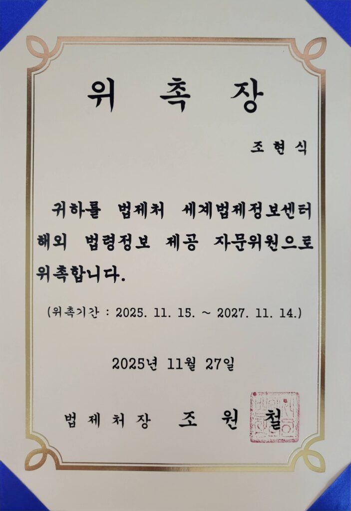 - 기후에너지환경부 고문변호사 위촉해바람 법률사무소의 조현식 변호사가 기후에너지환경부 고문변호사로 위촉되었습니다. 위촉기간은 2026년 2월… 자세히 보기: 기후에너지환경부 고문변호사 위촉